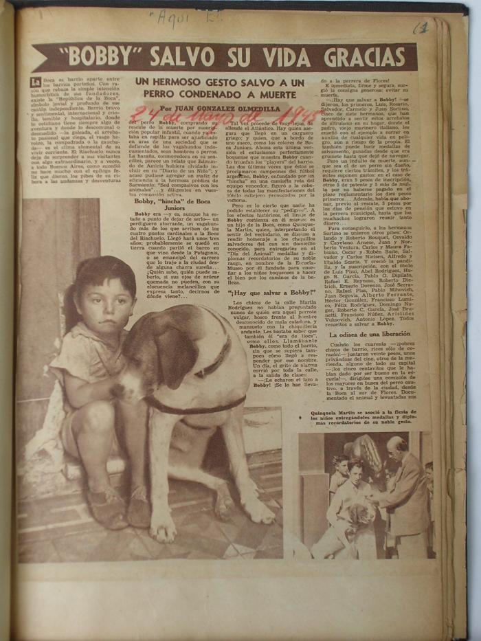 El Perro Boby f.47; Un sentimiento infantil digno de apoyo f.48; crónica periodística f.49; algunas cartas, f.66; donación de Quinquela de medallas para quienes salvaron al perro, 1945, f.68-69; carta de Corina Esther Azócar, autora de la iniciativa de premiar el acto solidario, 1945, f.70-74.