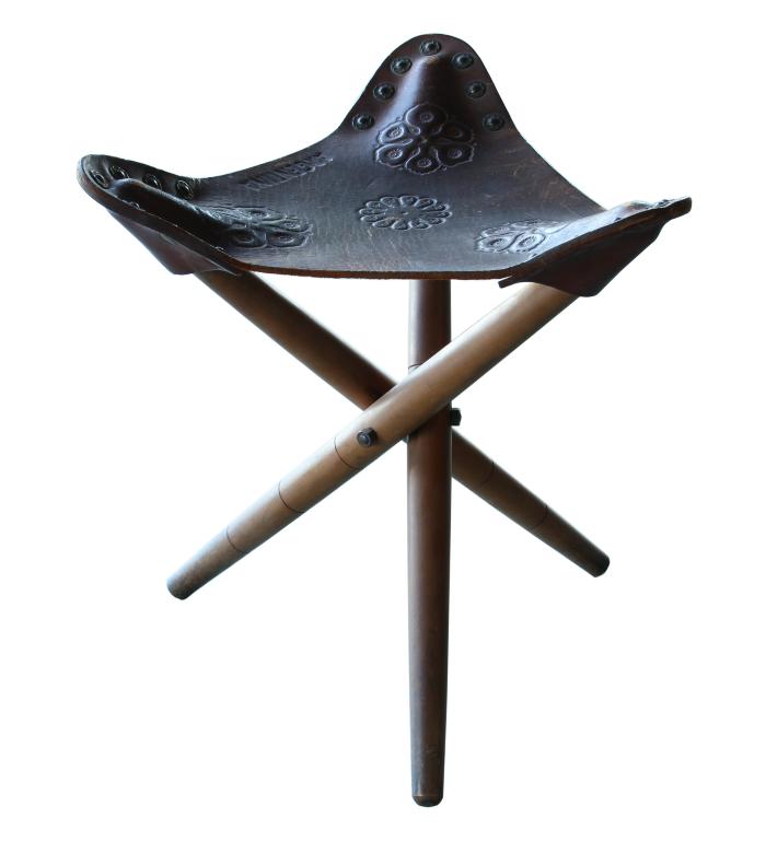 Taburete plegable con asiento de cuero labrado y patas de madera