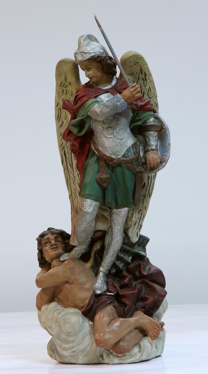La religión católica considera a San Miguel como el primero de los cuatro arcángeles, junto con Gabriel, Rafael y Uriel. En su calidad de protector de la Iglesia universal, Miguel es el encargado de frustrar a Lucifer, uno de los ángeles caídos, en su afán por instalar el mal en la Tierra. Por eso, en la historia del arte se lo representa con armadura de general romano, amenazando con una lanza o espada a un demonio o dragón. En ocasiones, se humanizan los rasgos del diablo en una figura completamente antropomorfa.