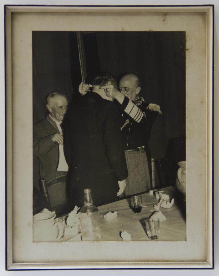 Fotografía enmarcada de Quinquela entregando el tornillo al Embajador de Japón Masao Tsuda