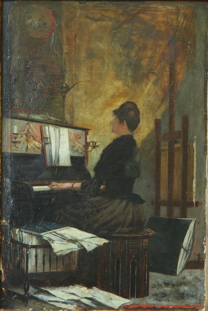 Muchacha sentada al piano fue sustraída en horas del mediodía del 31 de mayo de 1952 por un joven que desmontó su bastidor, dejando el marco prolijamente colgado en la misma ubicación en que se exhibía. La noticia del robo, advertido por personal de limpieza de la institución, fue replicada en numerosos medios gráficos, los cuales relataban la preocupación del director del museo y denunciante, Benito Quinquela Martín, por el valor histórico de la obra más que por su valor material. Fue tal la repercusión del hecho y las especulaciones generadas en torno suyo, que un galerista de la calle Arenales, Livio Bacchi, descubrió a los diez días que la obra reproducida en los periódicos coincidía con una pieza que le habían ofrecido en venta en circunstancias poco usuales. Afortunadamente, la devolución se hizo de forma inmediata, ya que Quinquela reconoció que el ladrón había lijado la información del anverso de la obra, donde constaba su procedencia. Entre lamentos, el boquense declaró que a partir de esa mala experiencia iba a implementar rutinas de vigilancia en el museo, otorgándole un tinte de severidad que hasta el momento no tenía.