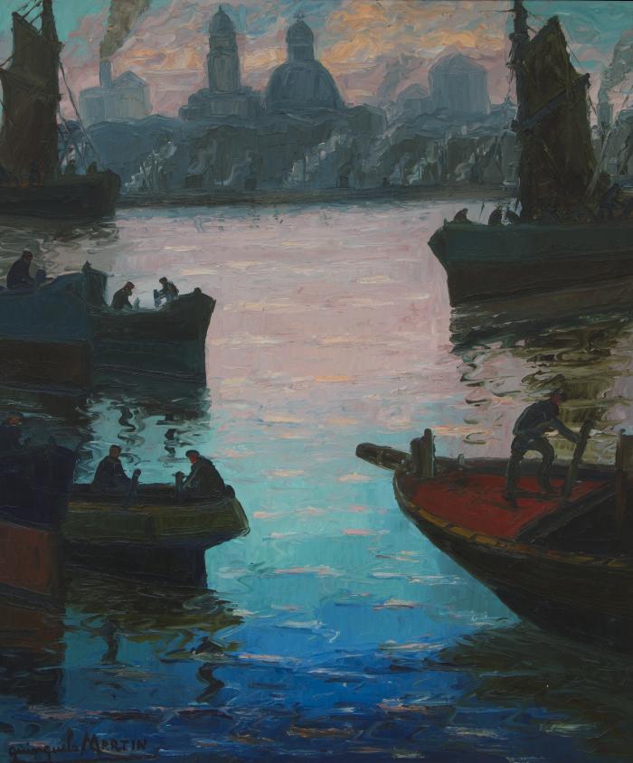 En esta obra, Quinquela eligió despojar al Riachuelo de su frenética actividad para ofrecer un panorama de progresivo ocaso, enmarcado por la silueta de la Iglesia San Juan Evangelista.