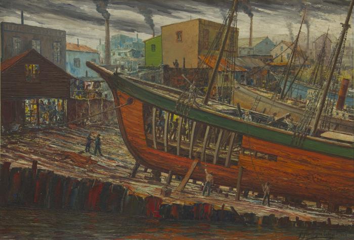 Más allá de los mitos y realidades, es innegable que la impronta del barrio se volvió inconfundible tanto para los pobladores locales como para los visitantes extranjeros, y se transformó en un referente ineludible de la cultura porteña toda, capaz de aunar en un breve territorio la presencia histórica de destacadas personalidades del arte. Aquí, presentamos una visión de Abelleyra Cabral acerca de una vieja barcaza a pie de un astillero: el amarre fluvial, las viviendas coloridas y las chimeneas humeantes describen los componentes infaltables de un barrio legendario.