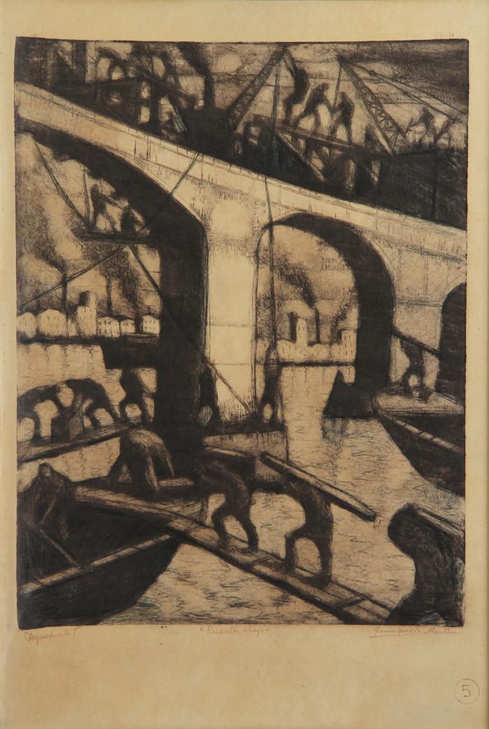 El par de aguafuertes Puente viejo y Puente nuevo abordan parte de la historia del Puente Transbordador Nicolás Avellaneda, tendido sobre el Riachuelo entre el barrio de La Boca y la Isla Maciel. Es un Monumento Histórico Nacional y uno de los últimos ocho puentes transbordadores todavía en pie en el mundo, así como el único en el continente americano. Fue construido por la empresa Ferrocarril del Sud en 1914 y es considerado un ícono de la ingeniería de la época, además de ser señalado como uno de los paisajes más emblemáticos de Buenos Aires.